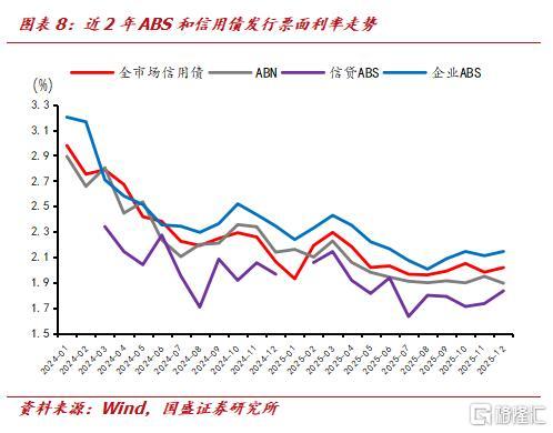 ABS一级市场呈现利率分化显著、短久期主导的供给特征。信贷ABS利率中枢最低、波动最小,ABN定价与信用债贴合度较高,企业ABS因资产与主体差异较大,票面利率整体更高。市场发行以1-2年期短久期产品为主,中长期产品供给相对稀缺。从利差结构看,信贷ABS依托银行主体与标准化资产成为市场安全垫,利差处于低位;ABN以城投、国企资产为主,利差居中、具备收益弹性;企业ABS资产类型多元,是利差分化的主要来源。