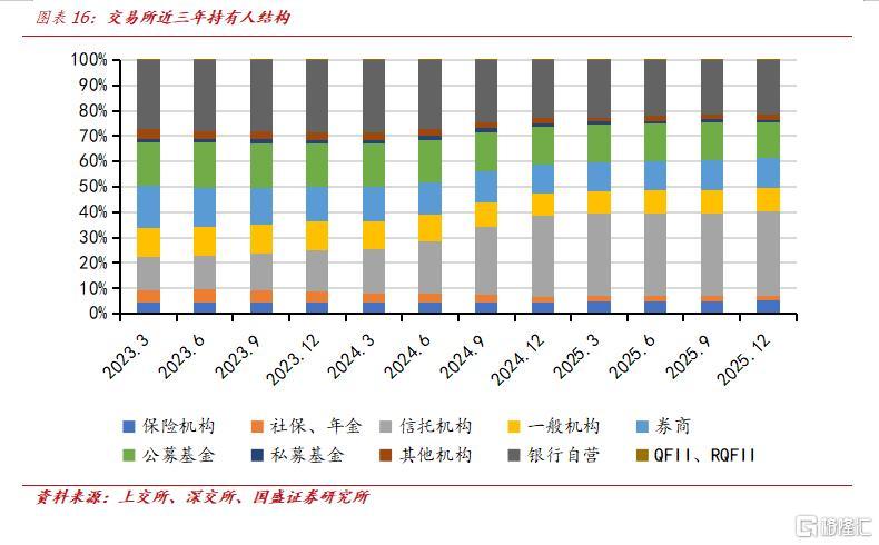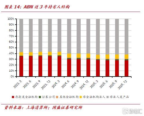 从2023年3月至2025年12月银行间和交易所ABS持有人结构的演变来看,持有人结构从银行主导逐步向多元参与转型。尽管银行间和交易所的核心持有主体虽有差异,但均围绕低波动、稳收益的配置诉求展开。