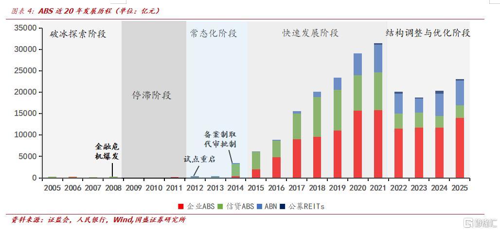 ABS虽然是小众品类,却与资产投融资周期深度绑定。二十年间随经济周期迭代,ABS走过从制度奠基到规模扩容、再到存量盘活的转型周期。2025年底全市场发行规模已回升至2.31万亿元。