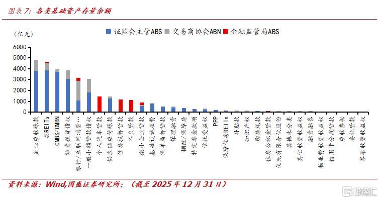 以全口径基础资产类型划分,截至2025年12月31日,全市场ABS存量基础资产类型有32种,前10大基础资产类型占总余额的86.4%。高度集中于企业应收账款、类REITs、CMBS/CMBN、融资租赁债权、银行/互联网消费贷款、一般小额贷款债权六大品种,产品以企业ABS和ABN为主。金融监管局ABS主要聚焦银行信贷类资产,核心覆盖个人汽车贷款、住房抵押贷款、不良贷款及小微企业贷款。整体来看,全市场 ABS 供给向核心主力资产集中,监管定位与资产属性形成较强绑定,共同构成了多层次、结构化的市场格局。