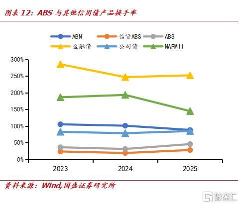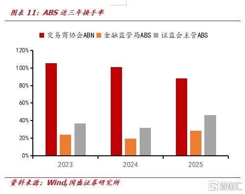 与信用债横向来看,ABS整体流动性明显弱于金融债、NAFMII债等品种,与公司债处于相近水平。从趋势看,2025年ABS 整体换手率有所回升,尤其是证监会主管 ABS 从 2024年的31% 提升至46%,市场交易活跃度有逐步改善趋势。