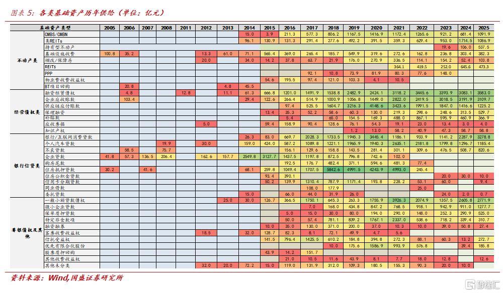 2005年4月,人行、银监会联合发布《信贷资产证券化试点管理办法》,标志着我国 ABS正式破冰。这一阶段恰逢地产黄金发展期与城镇化加速推进,住房按揭、企业经营贷款成为银行信贷主力,ABS试点也率先聚焦住房贷款、企业贷款、不良贷款等信贷类资产,同时基础设施收费权等其他资产也尝试入池。2008年全球金融危机爆发,资产证券化风险被广泛审视,叠加国内信贷政策收紧,市场随即陷入三年停滞,2009—2011年发行量近乎归零,基础资产类型始终停留在6种以内,整体处于试点试水的萌芽状态。